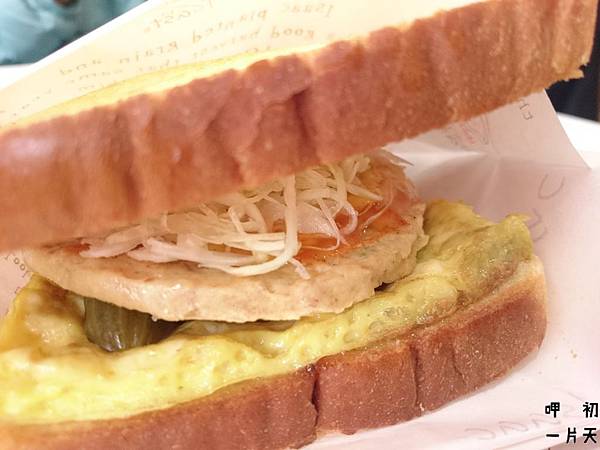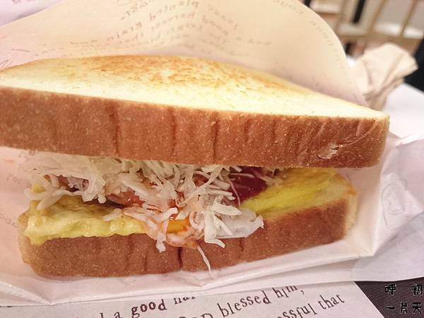 吐司內夾有豐富生菜 醃黃瓜 厚實的煎蛋 口感豐富 不錯吃